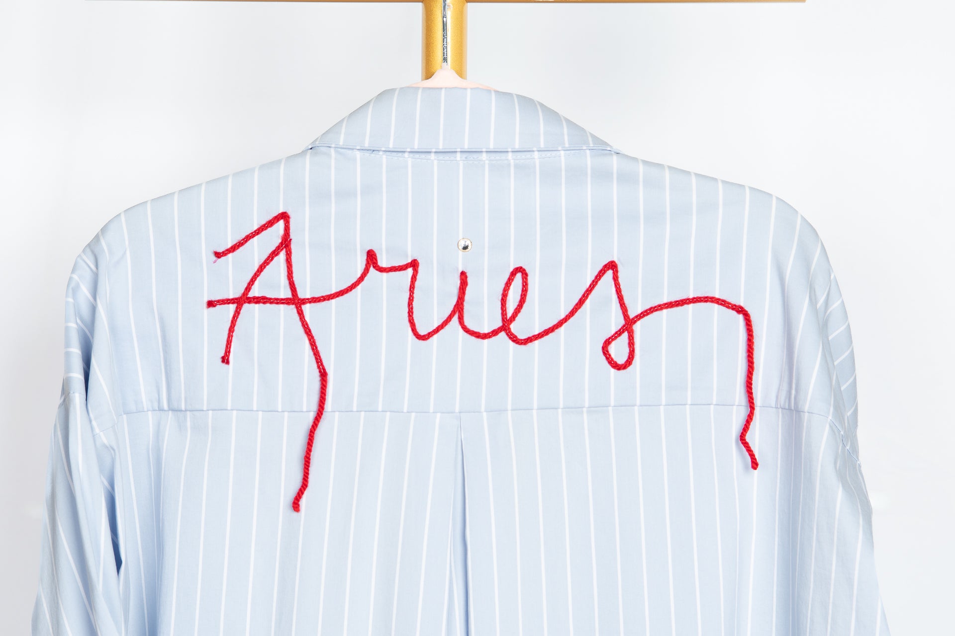 Segno zodiacale ricamato sul carrè della schiena con un filo in poliestere rosso