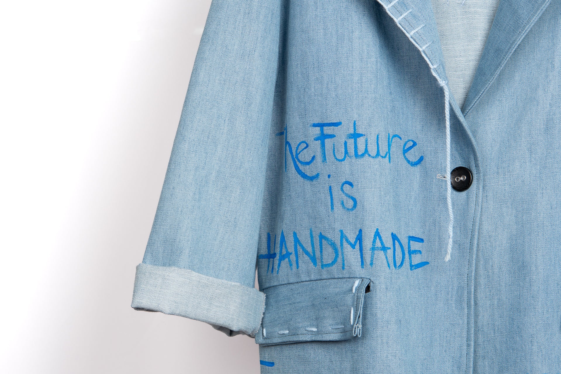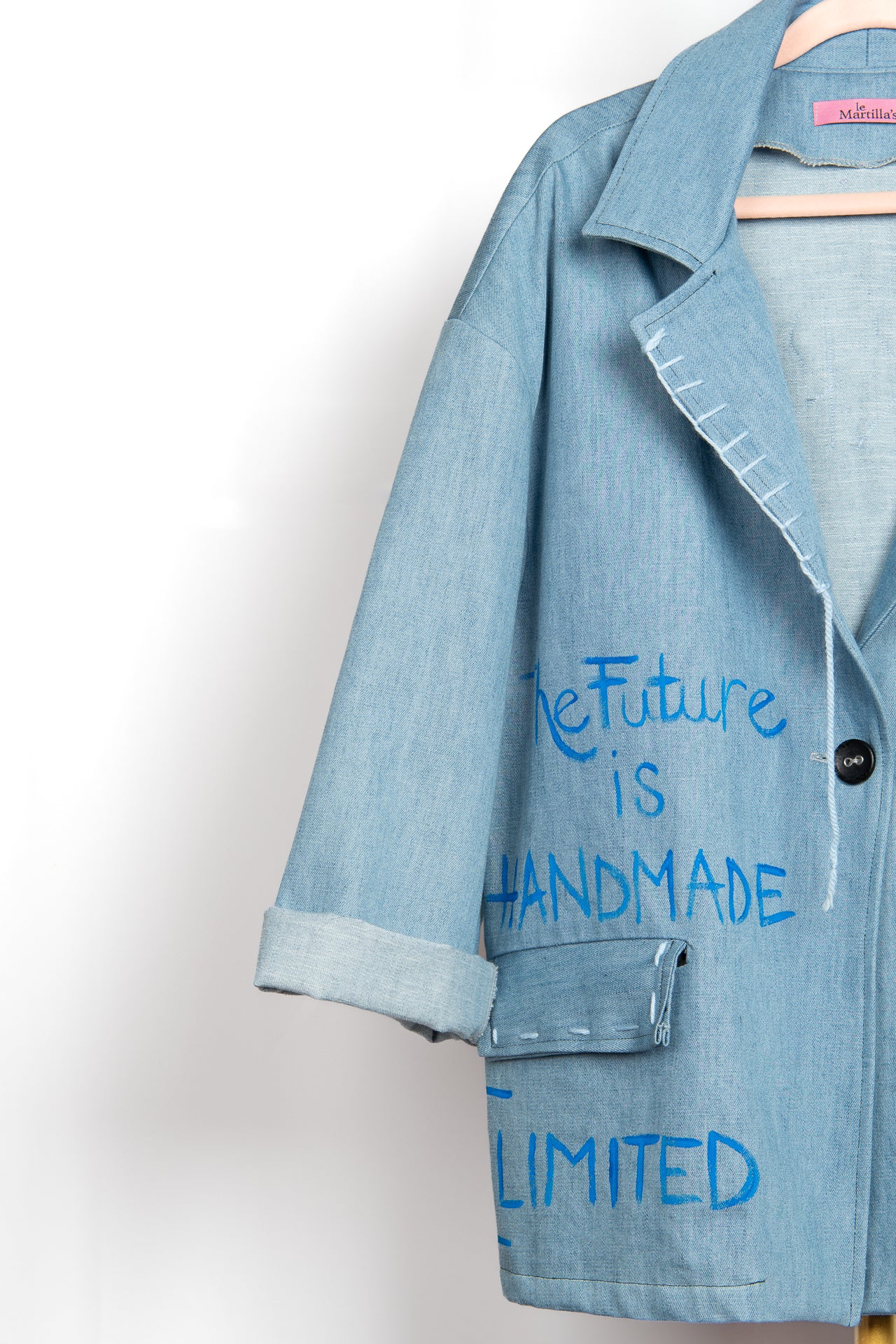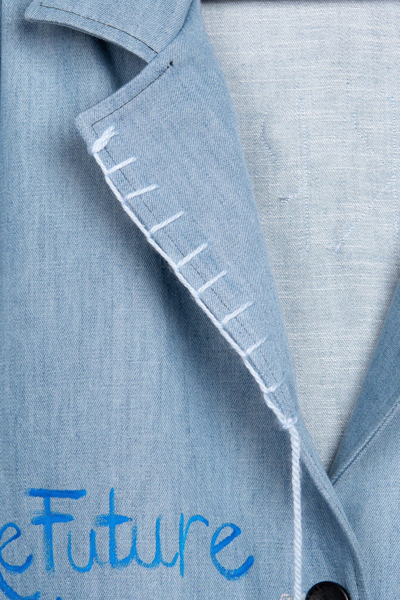 Punti ricamati con filo azzurro lungo il rever ,