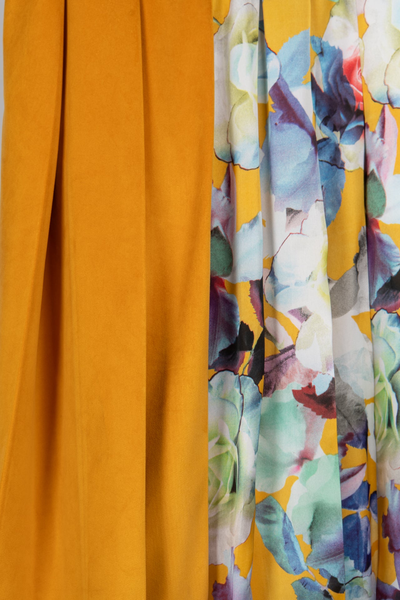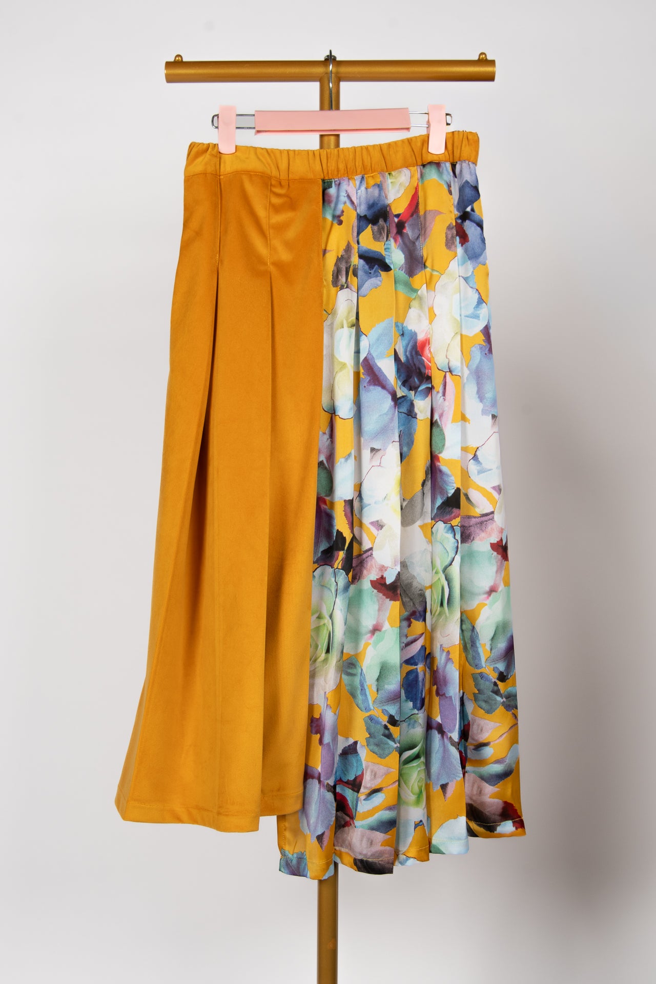 Gonna tipo a pieghe metà a sinistra velluto e l’altra metà in viscosa con lunghezza sfasata fantasia